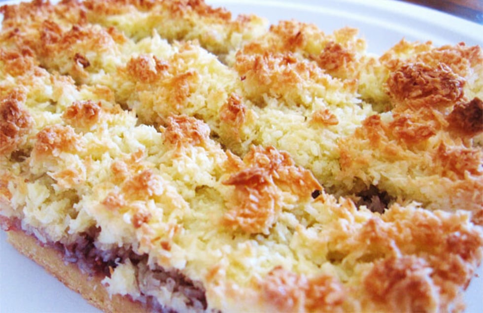 INGREDIENTS: 2 cups plain flour, 1 cup caster sugar, 125g butter, chilled, cubed, 3 eggs.1 tsp vanilla essence,3/4 cup raspberry jam, 2 cups desiccated coconut.